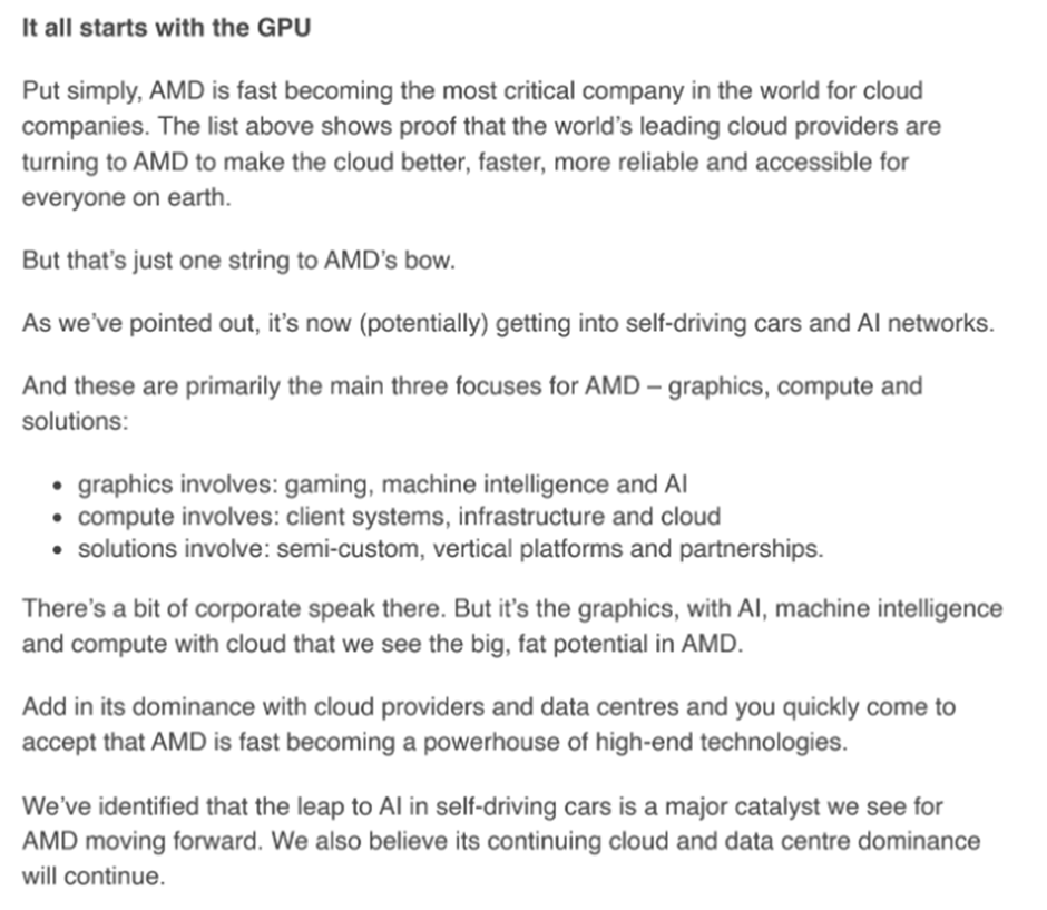 A couple of years later in 2018, I also decided that it was time to bring in the closest competitor to Nvidia as a recommendation. The reasoning for this other company was simple, it was entrenched in data centres, cloud, AI and self-driving cars.